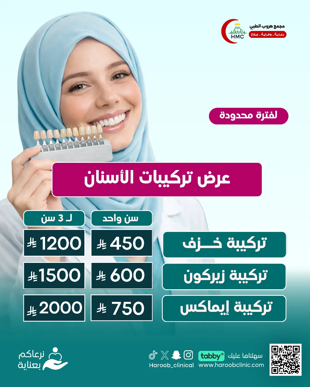 | اختر العرض | تركيب سن واحد خزف 450 ريال, تركيب 3 سن خزف 1200 ريال, تركيب سن واحد زيركون 600 ريال, تركيب 3 سن زيركون 1500 ريال, تركيب سن واحد إيماكس 750 ريال, تركيب 3 سن إيماكس 2000 ريال |
