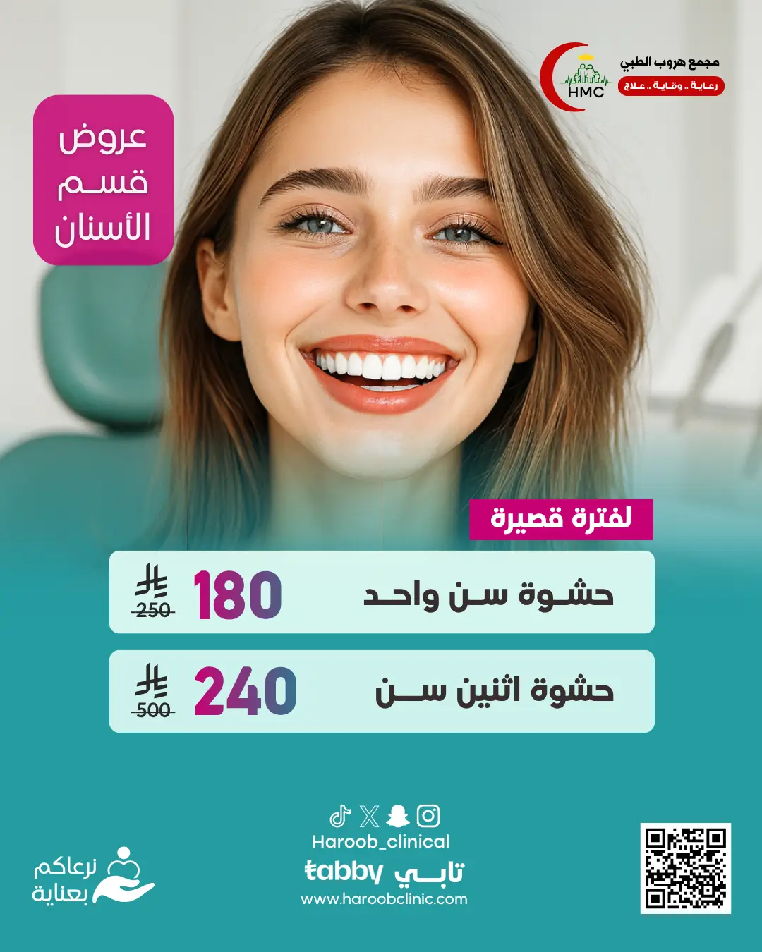 حشوة سن واحد فقط 180 ريال, حشوة 2 سن فقط 240 ريال