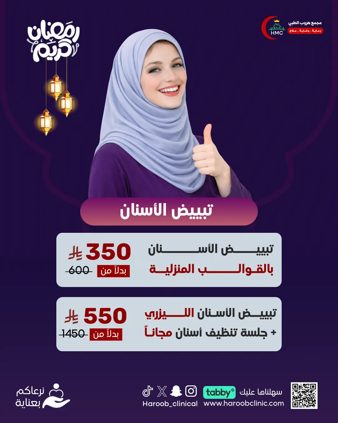| اختر العرض | تبييض الأسنان بالقوالب المنزلية 350 ريال, تبييض الأسنان الليزري بالتقنية الألمانية + جلسة تنظيف أسنان مجاناً 550 ريال |