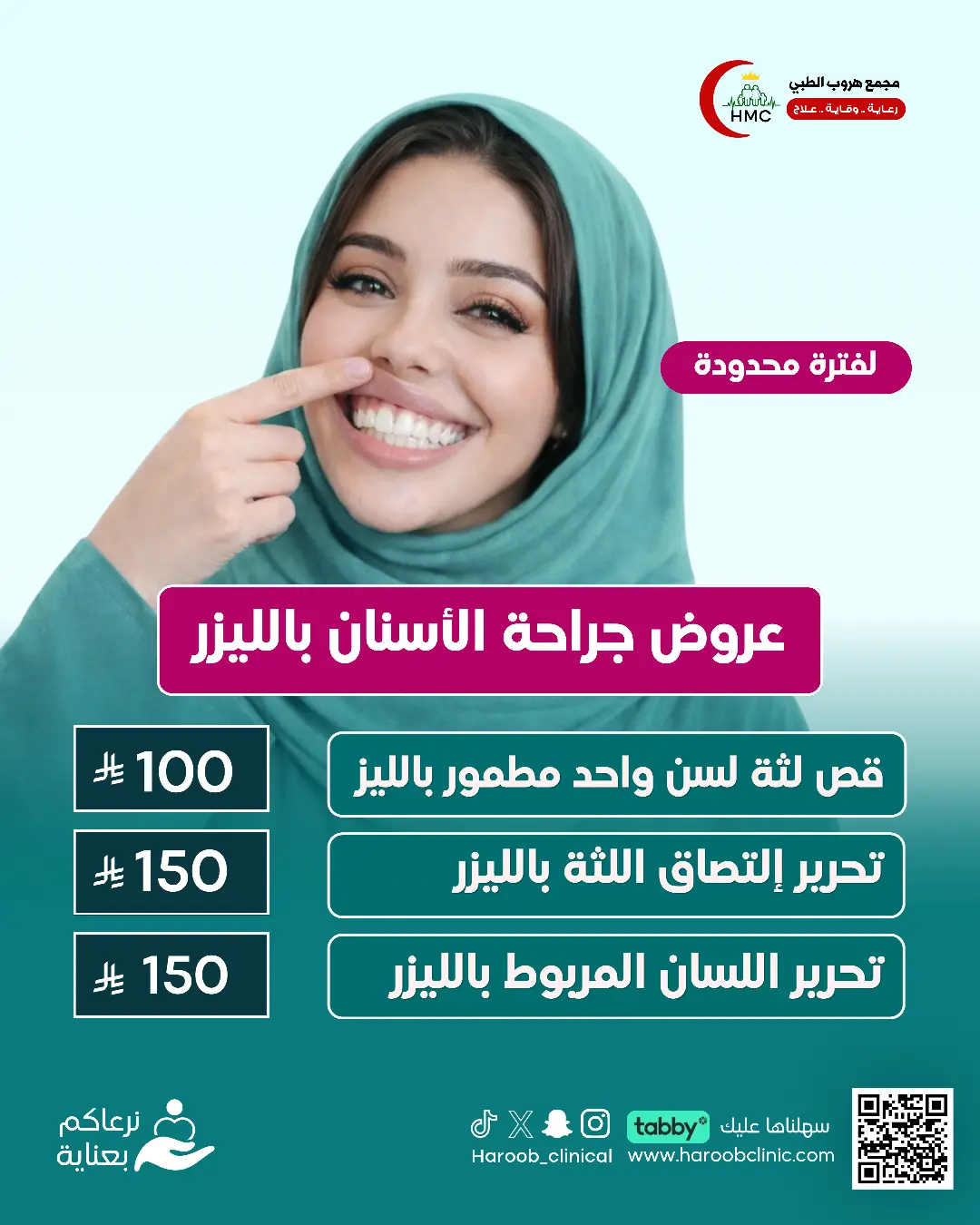 | اختر العرض | قص اللثة بالليزر لسن واحد مطمور 100 ريال, تحرير التصاق اللثة بالليزر 150 ريال, تحرير اللسان المربوط بالليزر 150 ريال |