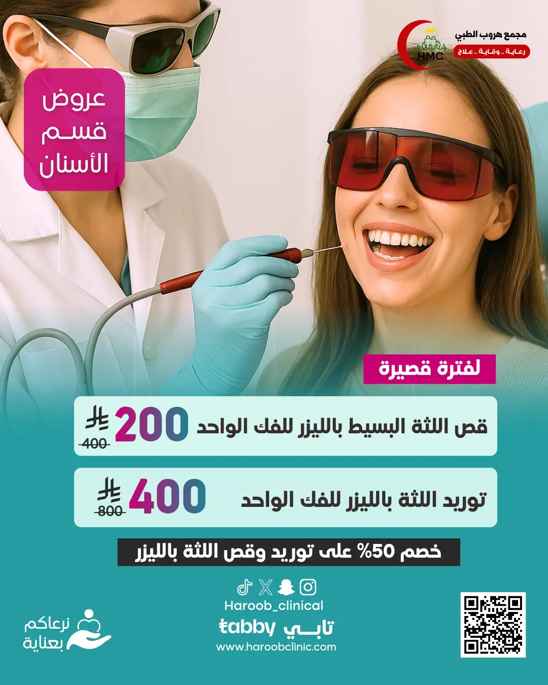 | اختر العرض | قص اللثة البسيط بالليزر فك واحد 200 ريال, توريد اللثة بالليزر فك واحد 400 ريال |