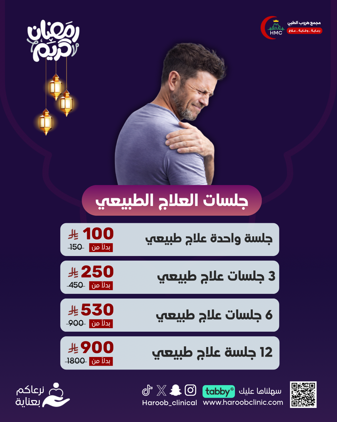 | اختر العرض المناسب | جلسة واحدة علاج طبيعي 100 ريال, 3 جلسات علاج طبيعي 250 ريال, 6 جلسات علاج طبيعي 530 ريال, 12 جلسة علاج طبيعي 900 ريال |