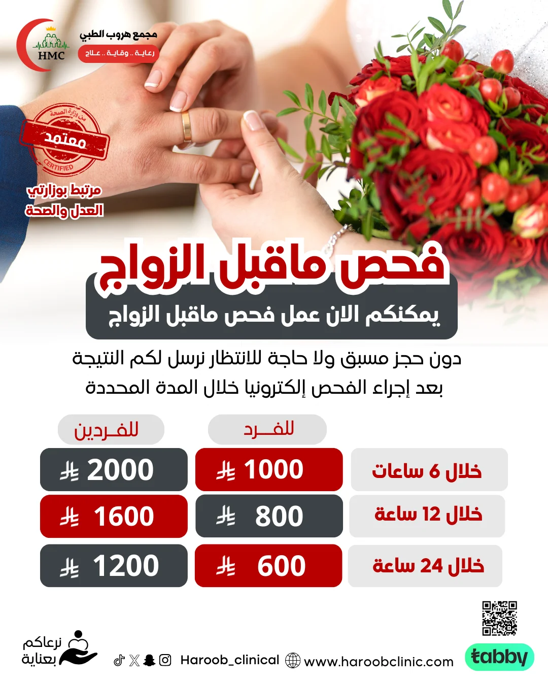 | اختر العرض | فحص ما قبل الزواج خلال 6 ساعات ( للفرد ) 1000 ريال, فحص ما قبل الزواج خلال 6 ساعات ( للفردين ) 1800 ريال, فحص ما قبل الزواج خلال 12 ساعة ( للفرد ) 800 ريال, فحص ما قبل الزواج خلال 12 ساعة ( للفردين ) 1500 ريال, فحص ما قبل الزواج خلال 24 ساعة ( للفرد ) 600 ريال, فحص ما قبل الزواج خلال 24 ساعة ( للفردين ) 1000 ريال, فحص ما قبل الزواج خلال يومين لثلاثة أيام ( للفرد ) 500 ريال, فحص ما قبل الزواج خلال يومين لثلاثة أيام ( للفردين ) 900 ريال |
